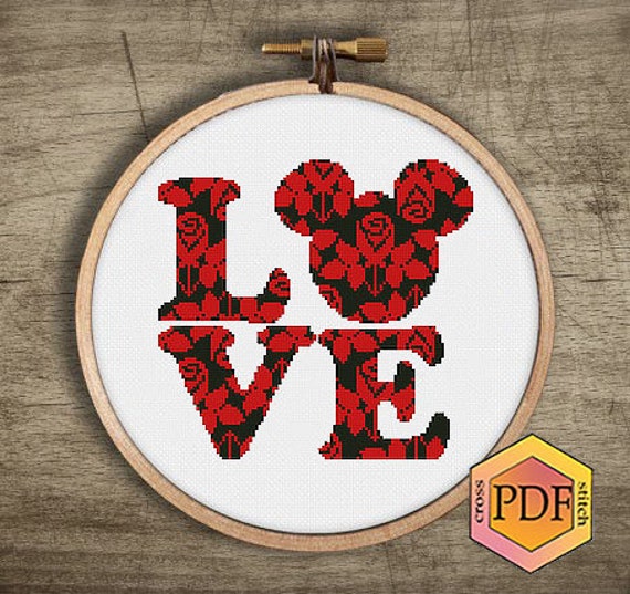 Disney Mickey Mouse Modern Cross Stitch Pattern Love Quote Counted Cross Stitch Chart Floral Embroidery Cute Nursery Decor Baby Instant Pdf
